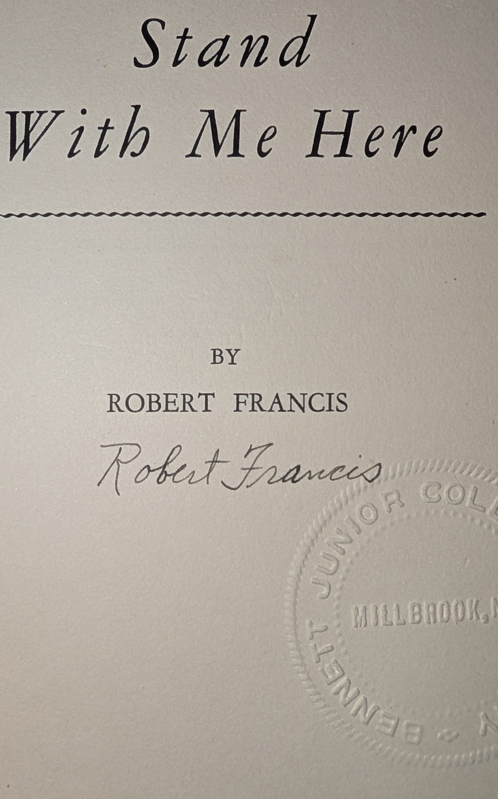 In my own curve, I decided to go digging through some of my first editions and pulled out Robert Francis’ 1936 Stand Here with Me. This particular copy was originally part of the library at the long-gone Bennett Junior College. It has both Francis’ signature and Bennett’s embossed seal. There’s something really spiritual about these remnants of former existence being on the page together. A reminder of impermanence and our own place in the cycles.